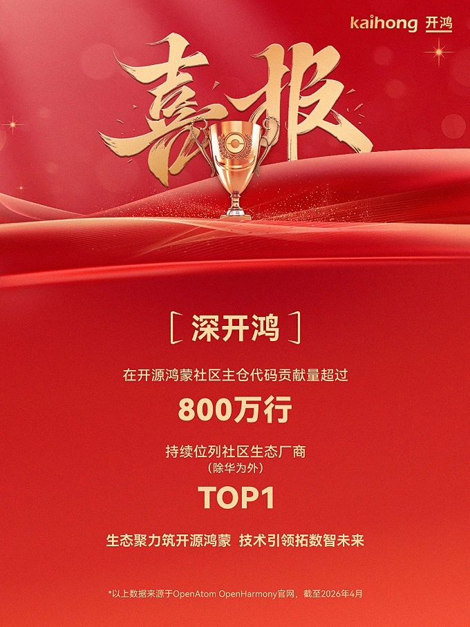 华为之外第一:深开鸿开源鸿蒙社区代码贡献量超过 800 万行