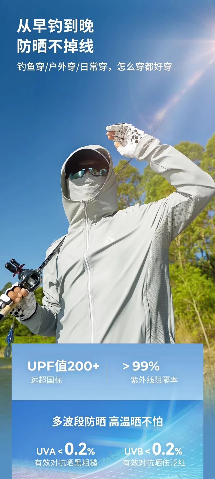 首先要看防晒性强不强。夏日水边紫外线强度极高,长时间暴晒易导致皮肤晒伤、晒黑,甚至加速光老化。阿玛迪斯专业防晒钓鱼服采用高规格防晒面料,防晒指数UPF200+,可高效阻隔99%以上的紫外线,且防晒性能经反复洗涤后依旧稳定,无需频繁补涂防晒霜,就能实现全方位防护。同时,一体式连帽与防护面巾,360°覆盖面部、脖颈、耳后等易被晒伤的部位,让钓鱼爱好者在烈日下也能安心守钓,无惧紫外线侵袭。
