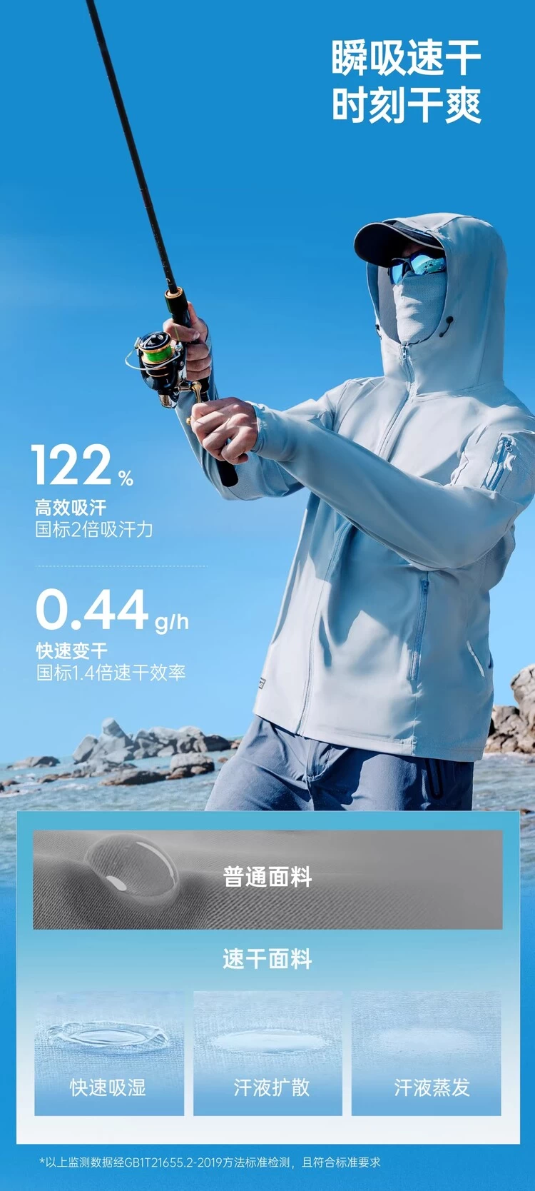 同时,还要选择吸湿速干功能强大的防晒服。由于水边湿度大,汗液难以自然蒸发,易导致衣物贴身黏腻,影响垂钓动作。阿玛迪斯专业防晒钓鱼服的吸汗性能高达130%,可快速锁定体表汗液,避免汗水堆积;同时,速干速率达到0.5g/h,汗液导出后能快速蒸发,即便出汗量大、环境潮湿,也能快速恢复干爽,杜绝湿冷贴身的不适感,让钓鱼爱好者在抛竿、抬竿之间始终保持清爽自在。
