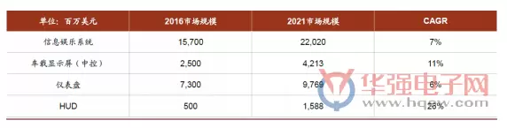 根据IHS Automotive统计,2016年全球座舱电子市场为287亿美元,预计到2021年将达到443亿美元,CAGR为9.1%。其中,车载信息娱乐系统占比较大,达到55%。仪表盘,车载显示屏(中控)和HUD分别占到25%,9%和2%。