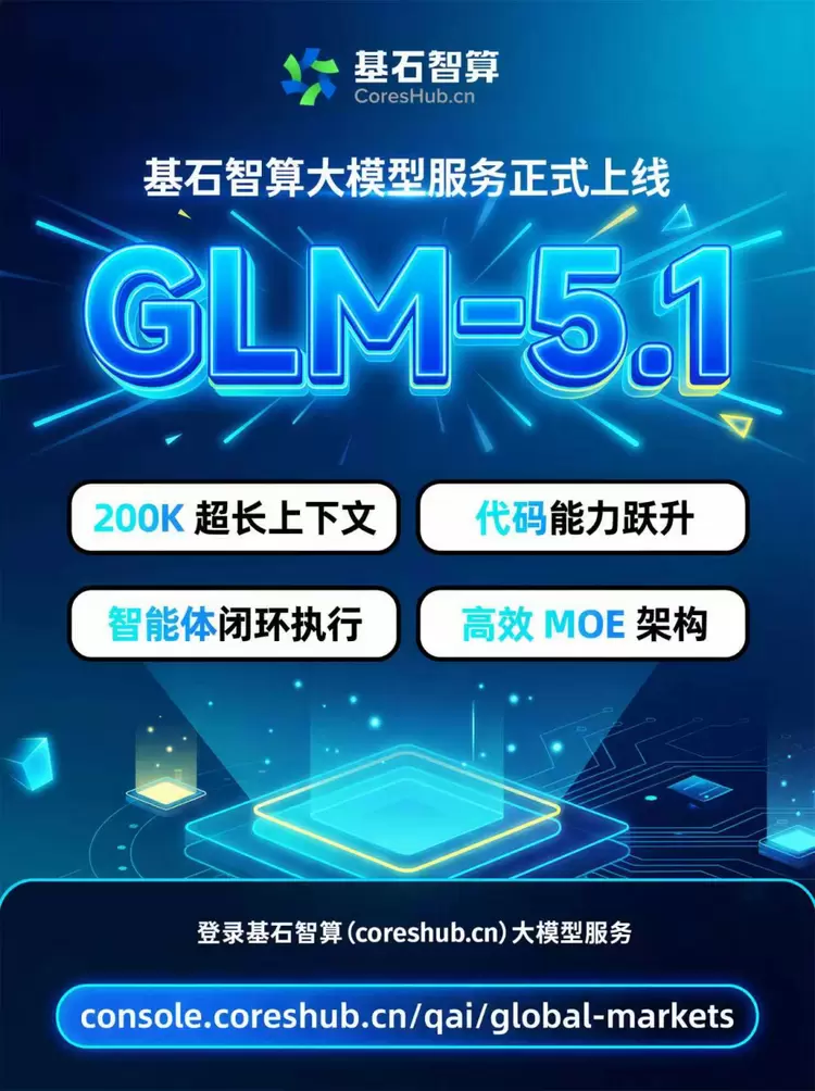 青云科技旗下 AI 算力云——基石智算CoresHub 大模型服务正式上线 GLM-5.1 !GLM-5.1 专注于复杂智能体工程与长周期任务执行,在推理、代码开发与长文本理解能力上实现显著升级,性能对标国际顶流。