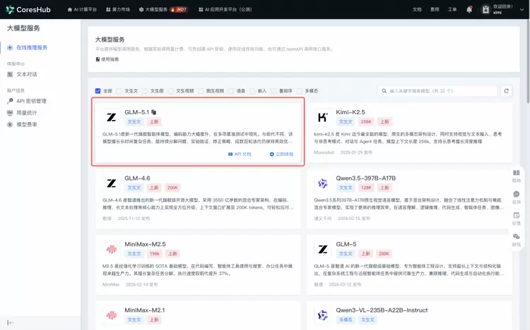 依托基石智算成熟的一站式智算服务能力,用户快速调用 GLM-5.1,高效落地 AI 编程、智能体、长文本分析等高阶应用。登录 CoresHub,进入大模型服务,即可立即体验!
