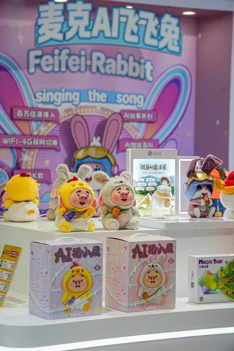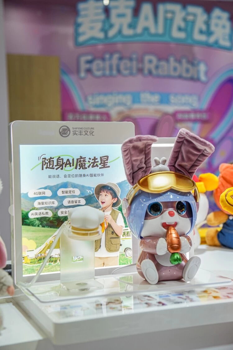 除上述两款首发新品外,实丰文化全系列AI玩具矩阵也同步亮相本次展会,展现了其在产品布局上的全面性与前瞻性。产品布局全面覆盖不同年龄段、不同消费需求的群体,形成了完善的产品体系。参展产品不仅包括随身AI魔法星、AI飞飞兔、麦克AI飞飞兔等自主研发的IP产品,还涵盖了小度熊、乖巧宝宝、猪小屁等知名IP的AI玩具系列,充分体现了其在IP运营与产品研发方面的多元布局。所有参展产品均遵循“一IP一特色”的产品开发理念,在外观设计、功能设置等方面贴合对应IP的核心特质,展会现场,不少观众驻足其展位,近距离体验各类产品的交互功能,现场互动氛围热烈。
