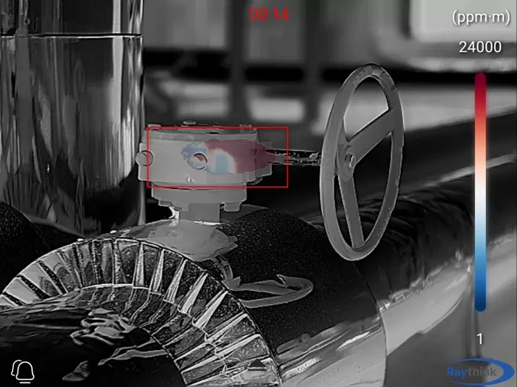 Raythink睿创燧石手持巡检热像仪搭载640×512定制带通滤波探测器,消除杂散光干扰。15mK高热灵敏度就可分辨0.015℃细微温差,捕捉更微量的气体;专业人员通过手持式红外气体成像仪对整个巡检区域进行大面积扫描探测,隐患点重点排查,一旦发现泄漏点得以快速锁定并展开维护检修。