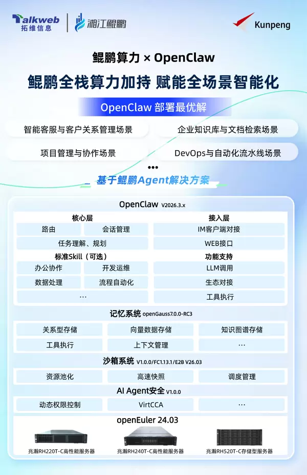 拓维信息旗下湘江鲲鹏作为华为鲲鹏生态核心伙伴,凭借多年国产算力深耕实践,联合华为鲲鹏重磅推出AI Agent一体化解决方案。方案深度适配OpenClaw全流程应用场景,从业务一线痛点出发,让智能体真正走出实验室、走进千行百业。