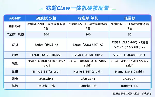不同规模、不同阶段的企业,对智能体的算力需求天差地别。为此,方案与基于鲲鹏920新型号处理器打造的兆瀚系列高性能服务器深度适配,提供轻量版、标准版、旗舰版三级配置,分别支撑50、100、200个OpenClaw实例并发运行,覆盖从入门调试到高并发生产级应用的全场景需求。在此基础上,方案以硬件重构、软件优化、生态协同为核心,从根源破解算力适配、部署效率、并发稳定、安全合规四大行业难题。企业可根据自身负载特征与上线阶段,灵活选择对应配置,在算力投入与业务产出之间实现精准匹配。