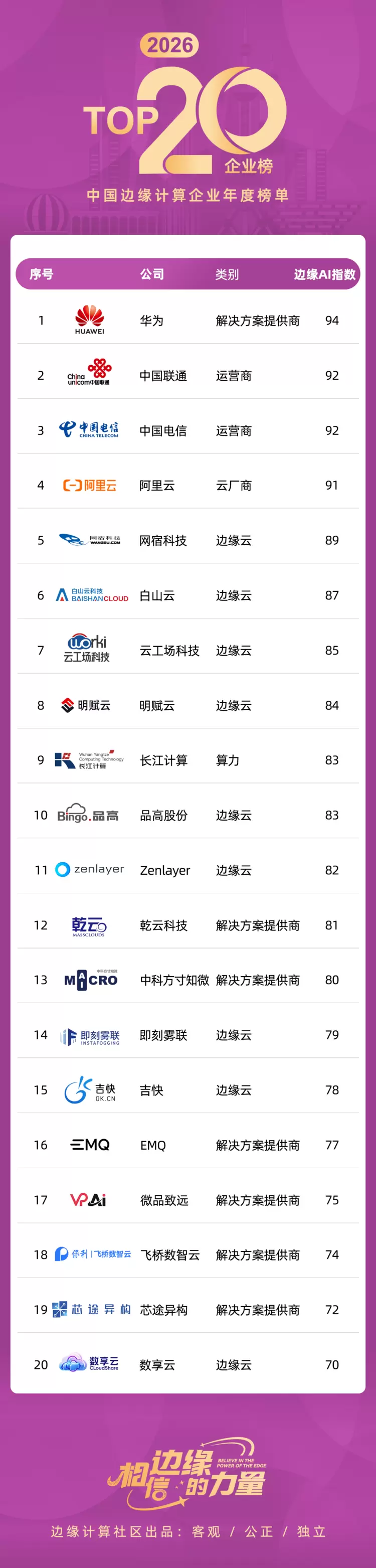4月8日,边缘计算社区正式发布“2026中国边缘计算企业20强”榜单,白山云成功入选并位居榜单前列。