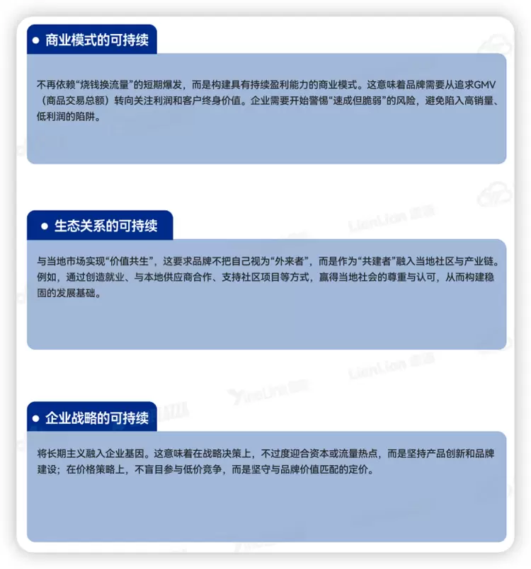 着眼未来行稳致远:坚持长期主义,放弃短期套利。商业模式从追求GMV转向利润与客户终身价值;生态上以“共建者”融入本地产业链,实现价值共生;战略上坚守产品创新与品牌定价,不盲从流量热点,走可持续发展路线。