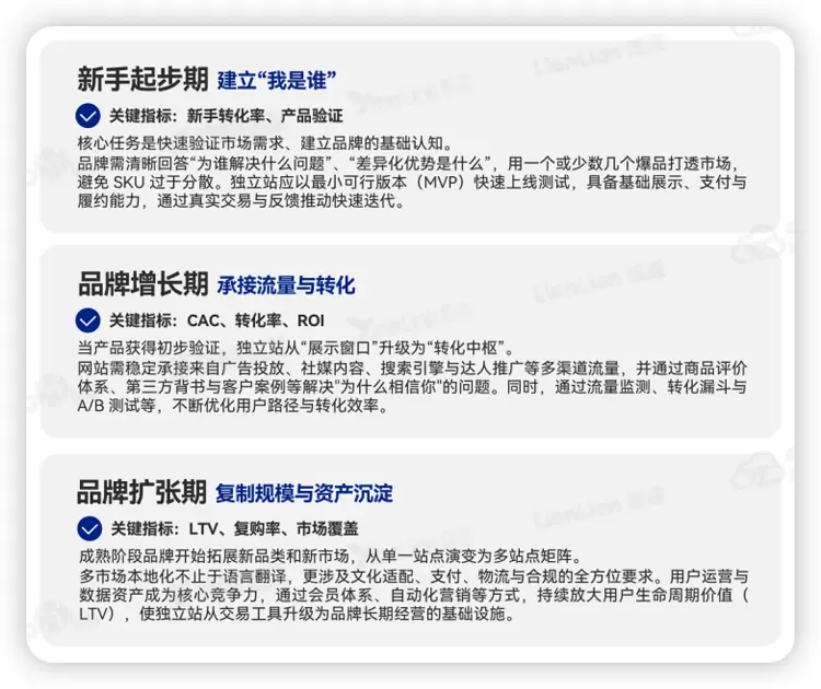 品牌增长期:升级为转化中枢,稳定承接多渠道流量,搭建信任体系,通过数据监测、A/B测试优化转化效率,关注CAC、转化率、ROI;