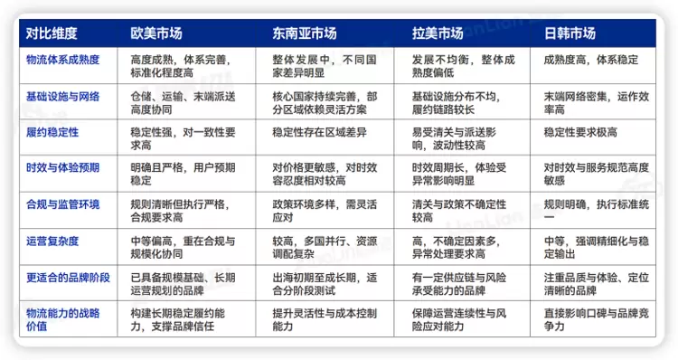 物流作为品牌出海的基础设施,决定了品牌全球触达半径、用户品牌认知、成本结构与运营韧性,不同市场物流生态差异显著:
