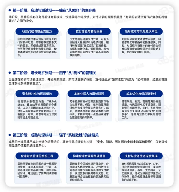 而目前,品牌出海支付面临三阶段痛点:启动与测试期痛于从0到1的生存难关、增长与扩张期困于从1到n的管理难关、成熟与深耕期谋于系统致胜难关。对此,《2026品牌出海行动指南》给出了拆解办法: