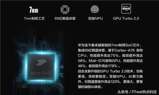 最为引人注目的麒麟980具备着大量新特性:全球首次采用A76和Mali-G76架构;全球最先支持LTE Cat.21;支持最快LPDDR4X内存颗粒,主频最高可达2133MHz;全球首款搭载双核NPU;以及安卓阵营首款商用7nm SOC。