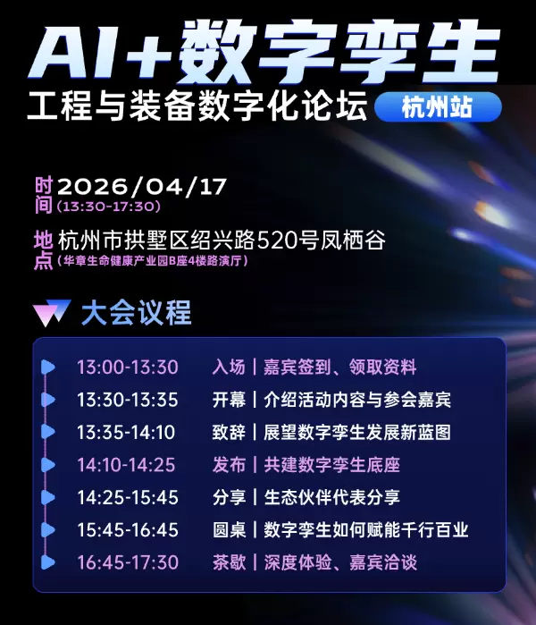——本期活动,将于4月17日(13:30-17:30)在杭州举行,活动主题为“AI数字孪生全链条服务体系·助力浙江省数字经济高质量发展工程与装备数字化论坛”。