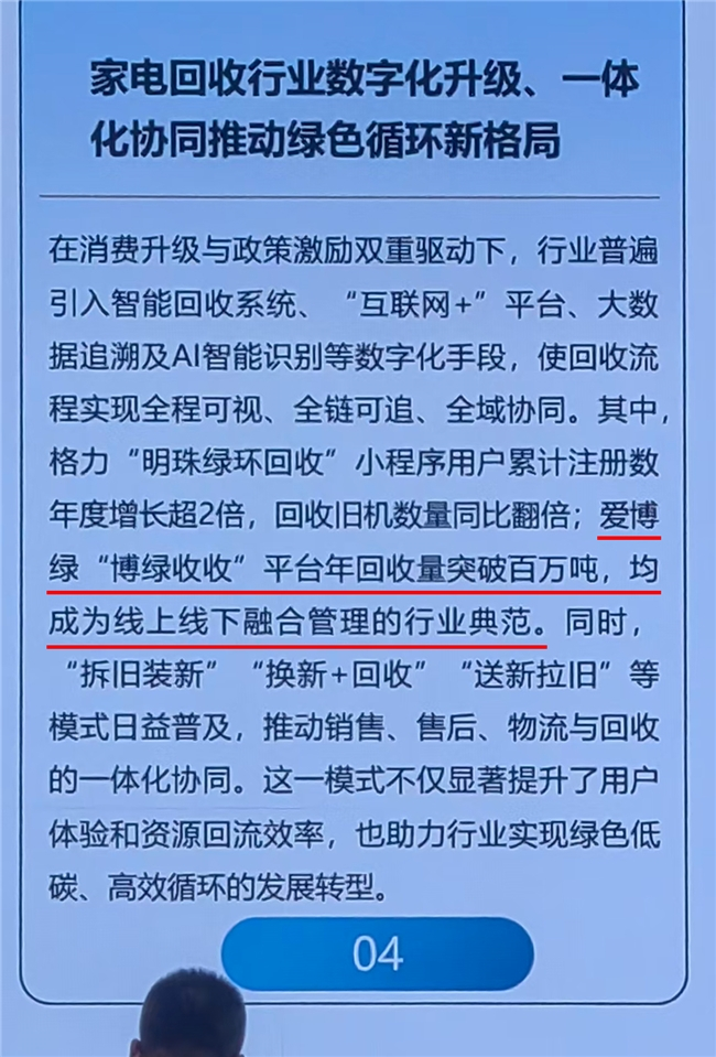 未来,爱博绿将遵循政府引导、企业运营、居民参与的服务理念,持续完善全国一体化再生资源回收利用网络,通过“线上数字化平台+线下多形态回收网络”联动,便民利民、降本增效,为行业的绿色高质量发展贡献力量。