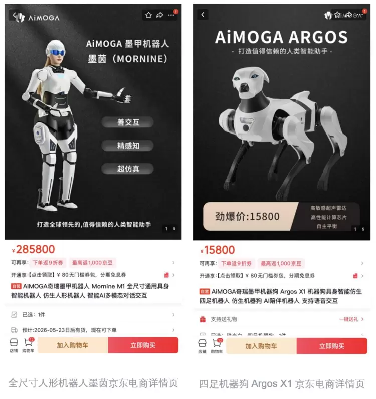 4月12日,奇瑞墨甲机器人京东官方旗舰店正式上线,人形机器人墨茵Mornine与机器狗Argos面向C端开放下单。这是墨甲机器人这两款产品首次以标准商品形态,通过电商平台进行规模化销售。也是两款产品在完成多场景落地验证后,首次以标准化商品形态进入电商渠道。