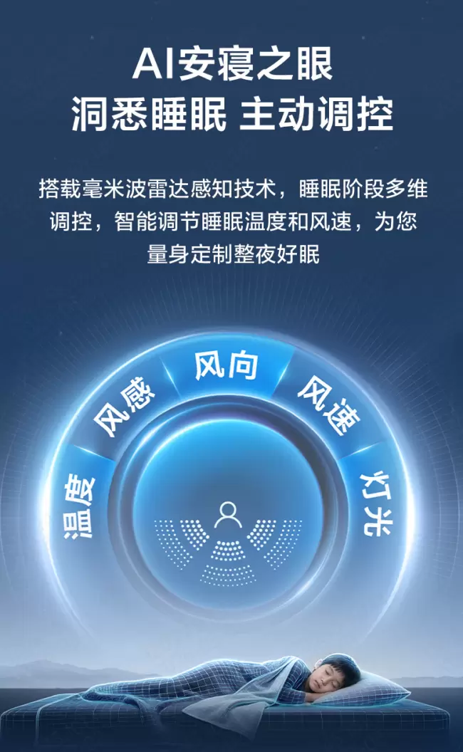 TCL小蓝翼P6 Ultra AI舒适睡眠空调正是洞察到了这一痛点,其搭载的AI安寝之眼睡眠科技,通过毫米波雷达感知技术,根据人体睡眠不同阶段体温变化规律,智能检测用户睡觉时的体动状态,智能调节睡眠温度和风速;并通过AI遗传算法,学习用户睡眠习惯,为每个用户定制专属睡眠温度曲线。
