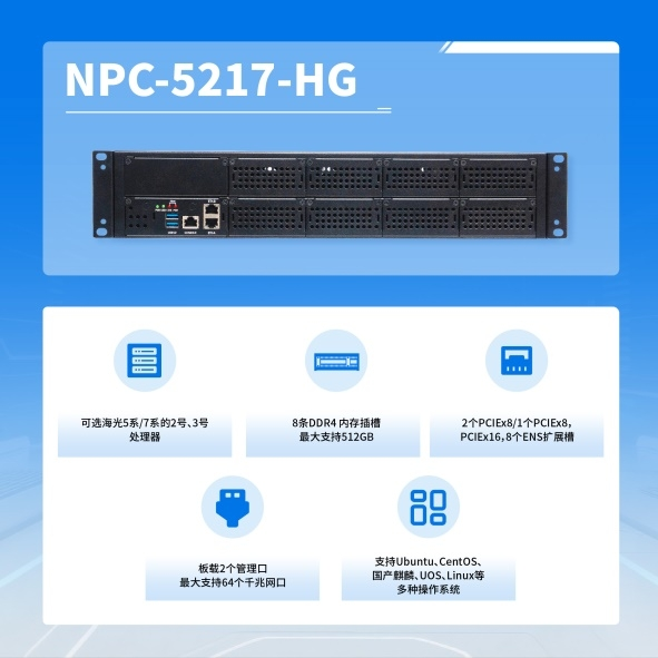 在整个方案中,研祥智能NPC-5217-HG发挥着重要作用,它采用国产海光平台,网络吞吐能力超400G,具备丰富网络接口和网络扩展。这台设备承载着安全网关、入侵检测、防火墙等关键节点的算力与网络吞吐任务,是整个方案中能够真正“扛活儿”的角色之一,也是国产化安全硬件底座上的一块重要拼图。