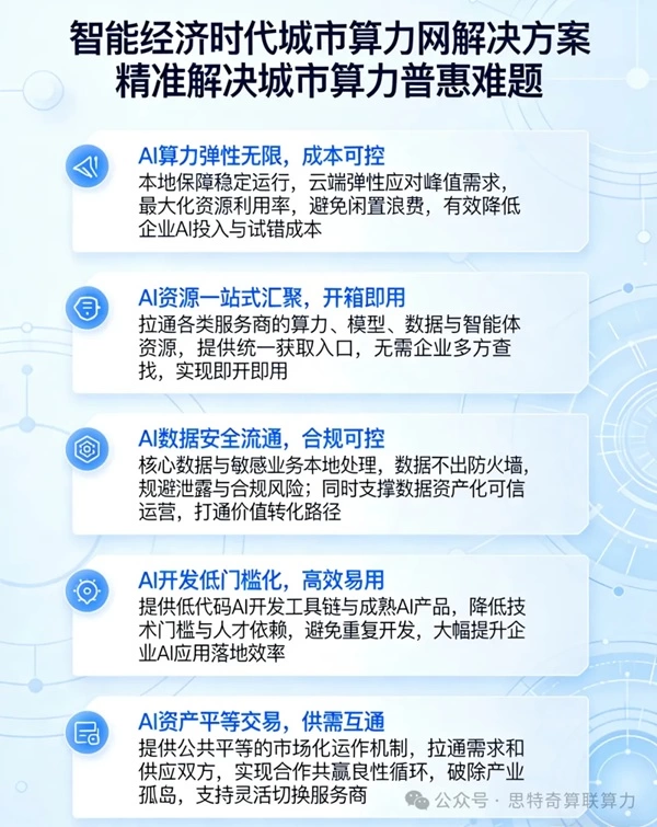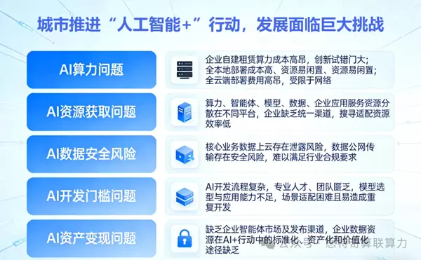 尽管全国一体化算力网建设已初具雏形,但国家枢纽节点算力资源与城市本地算力需求的“最后一公里”问题仍未解决,城市发展仍面临算力&AI资源获取困难、数据安全风险高、AI专业人才匮乏和AI资产交易问题等诸多挑战。