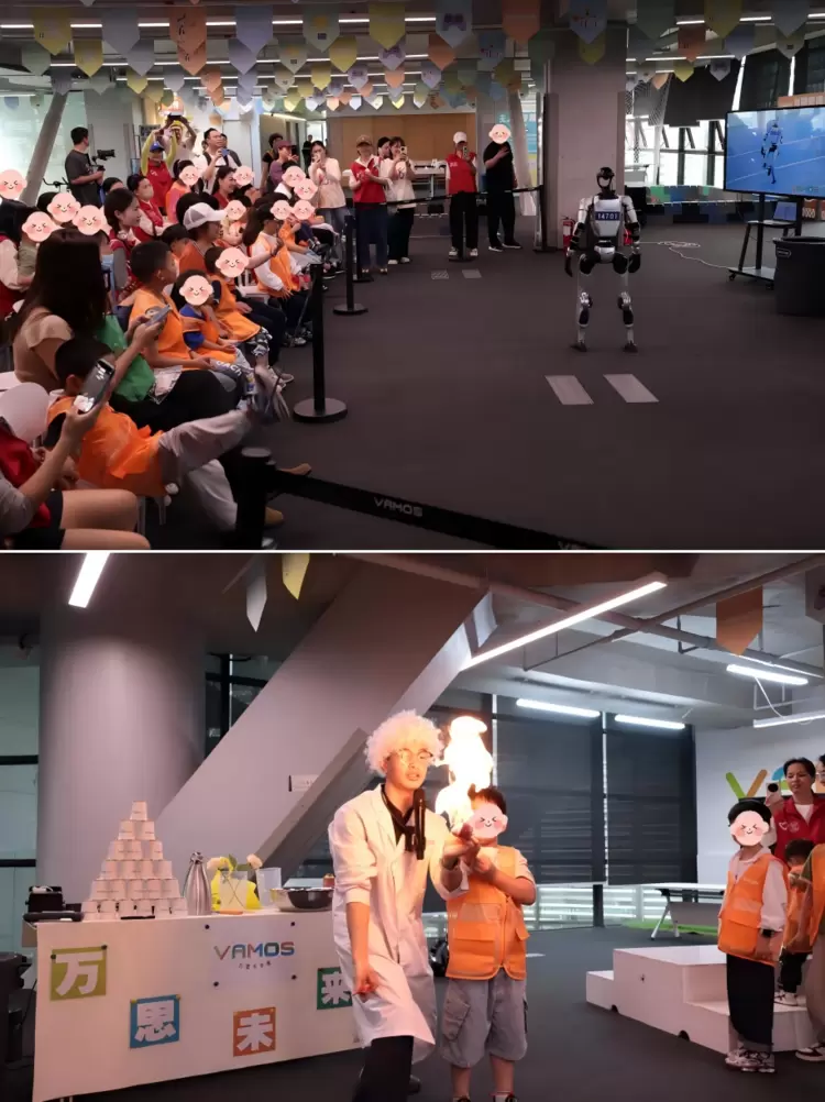第三站:智能机器人表演区,孩子们整齐就座,观看灵活生动的机器人现场表演。整齐划一的动作、趣味十足的互动,引得现场阵阵欢呼与掌声,让孩子们真切感受到科技带来的震撼与乐趣。