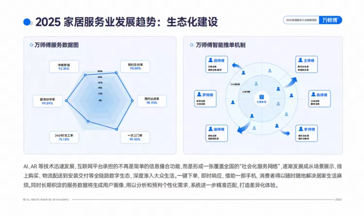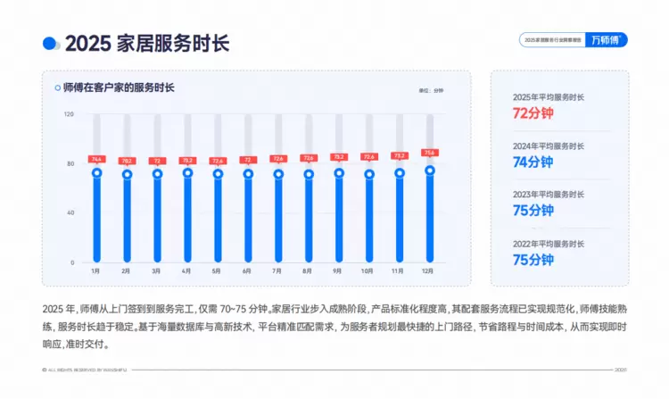 现如今,80后、90后已成为服务者主力,普遍接受过更系统的技能培训,对数字化工具的接受度更高。以万师傅平台为例,从上门签到到服务完工,2025年平均服务时长稳定在72分钟。