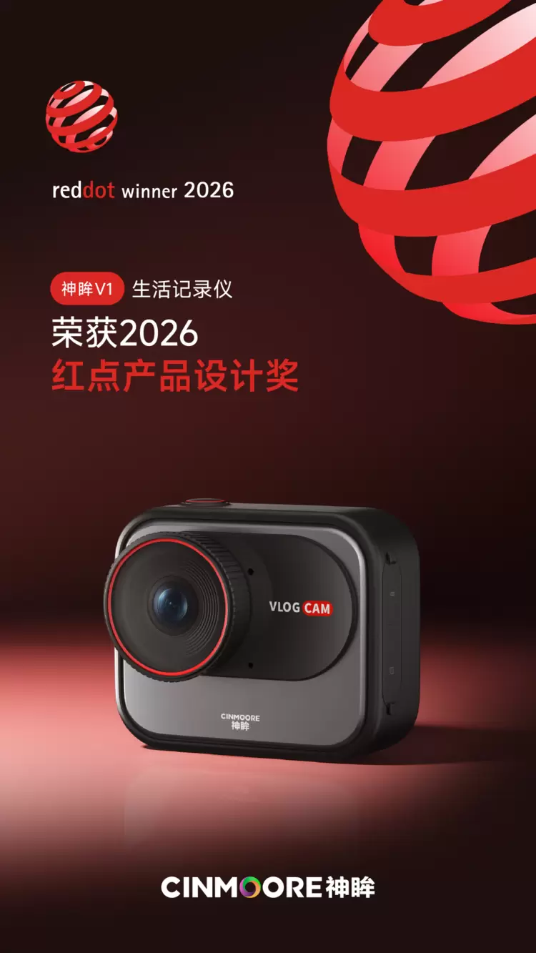 近日,全球设计界顶级赛事——2026年德国红点设计奖名单正式揭晓。神眸(CINMOORE)自主研发的神眸V1生活记录仪,凭借突破性的工业设计语言与精准洞察生活记录场景的创新理念,在全球众多参赛产品中脱颖而出,斩获2026红点产品设计奖。