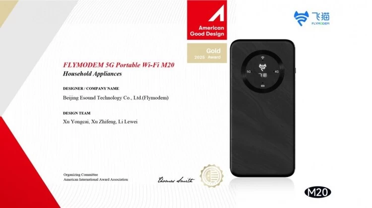 近日,国际权威奖项美国好设计奖获奖名单揭晓,中国本土品牌飞猫旗下飞猫5G随身WiFi M20凭借创新设计、出色性能与绝佳用户适配性,成功斩获金奖,成为随身WiFi领域亮眼代表,彰显中国品牌在移动网络设备设计领域的卓越实力。