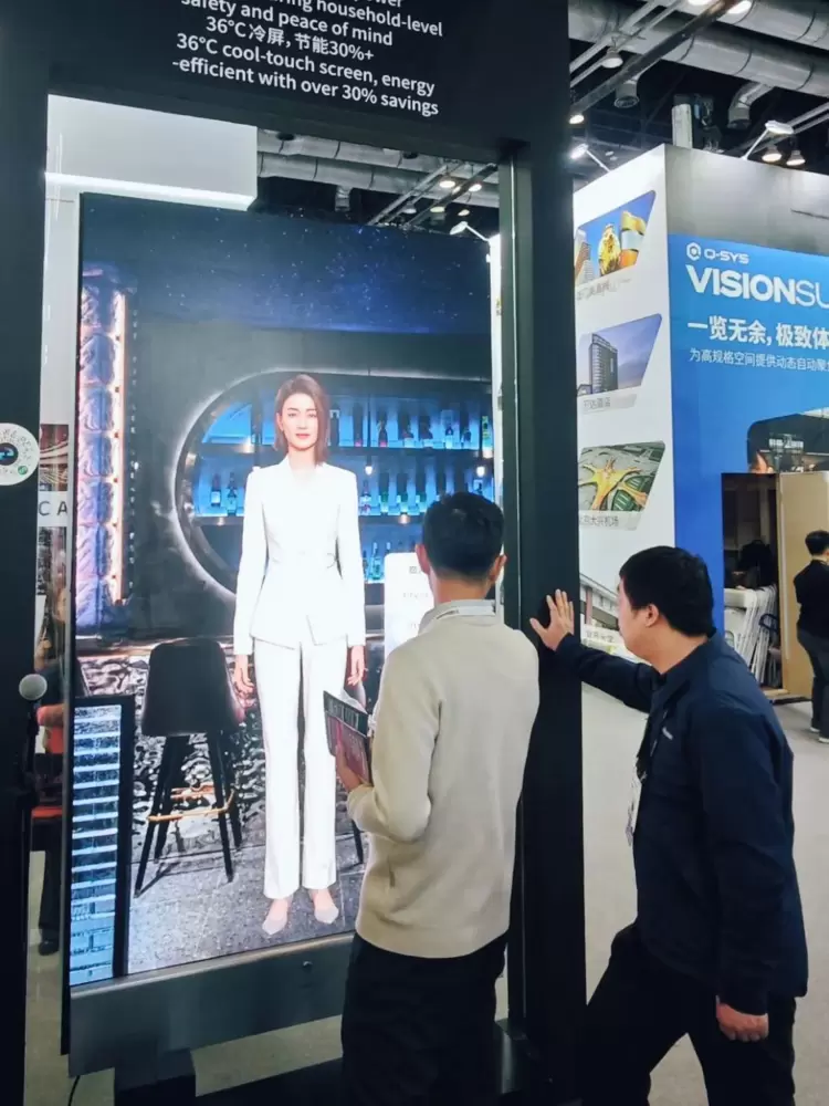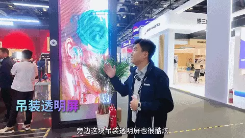 与之相伴的是吊装的透明屏UVF系列,它的视觉内容均由AI驱动生成,科技感拉满。