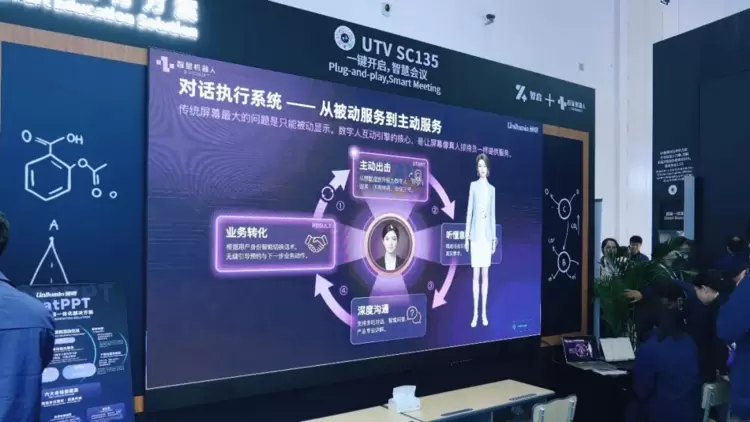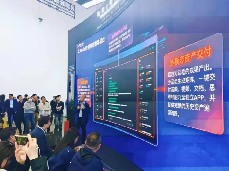 全新AI指挥中心解决方案的“灵魂”,是“智脑(Zbrain)底座+数字人助理”。展位现场的AI数字人不仅能活灵活现地讲解,还能跟观众交流。这里的后台能跟灯光、音响等物理设备互联互通。只需一句语音驱动,系统即可实现跨设备联动与业务界面的智能排布,实现沉浸式的指挥调度体验。