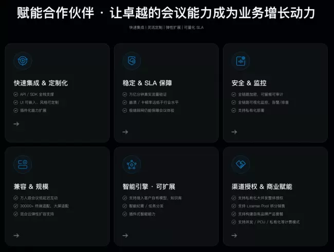 当 AI Agent开始自主撰写会议纪要、生成待办事项,甚至回写业务系统完成闭环,企业对会议系统的需求已悄然改变。传统的SaaS 会议软件凭借“开箱即用”完成了市场普及,但在 Agent时代,政企客户对会议的真实诉求不再是标准化功能堆砌,而是安全可控的数据主权、适配业务流程的智能化能力,以及与IT 基础设施无缝集成的开放架构。具备安全可扩展、AI融合的会议能力底座,正成为政企会议基础设施的必然选择。