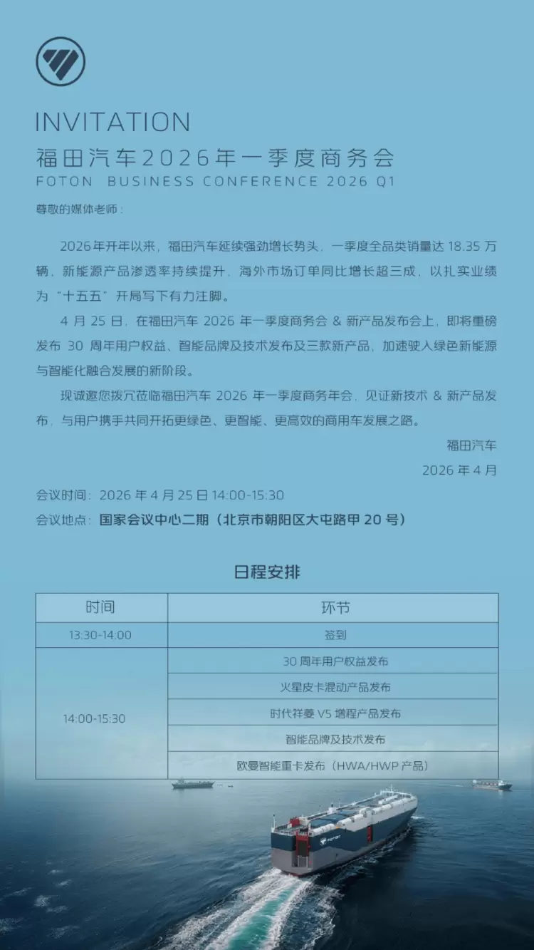 4月25 日邀您共鉴!福田汽车2026年一季度商务会新产品发布会即将启幕