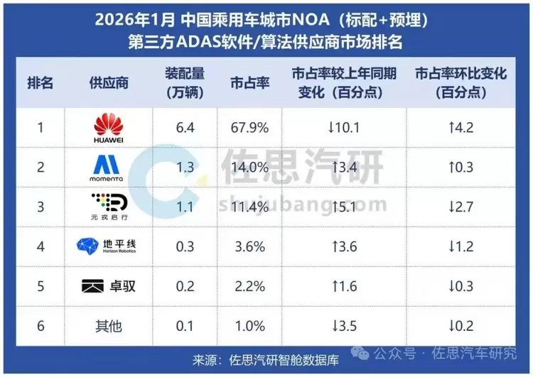 在城区辅助驾驶第三方供应商市场,行业呈现高度集中格局。华为乾崑、Momenta、元戎启行三家头部厂商合计市占率达到93.3%,形成清晰的头部引领态势。其中,华为乾崑智驾以67.9%的市占率位居首位,市场份额超过第二名与第三名市占率总和,在第三方方案中具备显著优势,成为车企与消费者高度认可的主流选择。