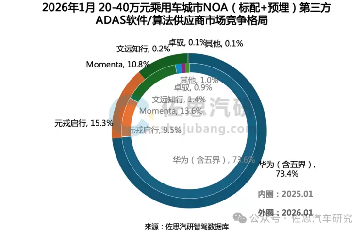 20-40 万元价位段是当前智能汽车的走量主力,也是行业公认的主流黄金价位段,对辅助驾驶方案的适配性、量产性与成本控制能力提出综合考验。数据显示,该区间头部三家供应商合计市占率已接近 99.5%,市场高度集中。华为乾崑以 73.4% 的市占率稳居第一,展现出在主流市场的统治力与规模化交付稳定性。