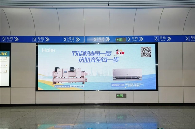 除了定制礼品,地铁通道内蓝白相间的海尔主题广告随处可见,“节能舒适每一度,热血奔跑每一步”“海尔磁悬浮,护航每一程奔赴” 等标语与城市风景相映成趣。青岛北站城市展厅里,海尔MX-Max AI 多联机、海尔磁气悬浮中央空调等产品实力展示,“全国 256 条地铁线路,都在用海尔中央空调”“节能 50%、舒适 100%、省心 100%”的展示,让跑者与市民近距离感受科技实力。