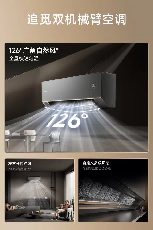 有了双机械臂驭风系统的加持,追觅高端旗舰空调X40成功地突破了传统固定导风板空调的先天结构局限,使左右出风口成为两个可独立执行复杂动作的智能风口。此外,凭借灵擎关节带来的±15°俯仰与135°水平旋转自由度,结合126°的广角送风能力,其舒适送风面积达到传统空调的6.6倍,能快速实现全屋匀温。追觅空调的这项创新,也标志着空调从固定方向的吹风设备,进化为可灵活塑造整个空间气流环境的空气智慧管家。