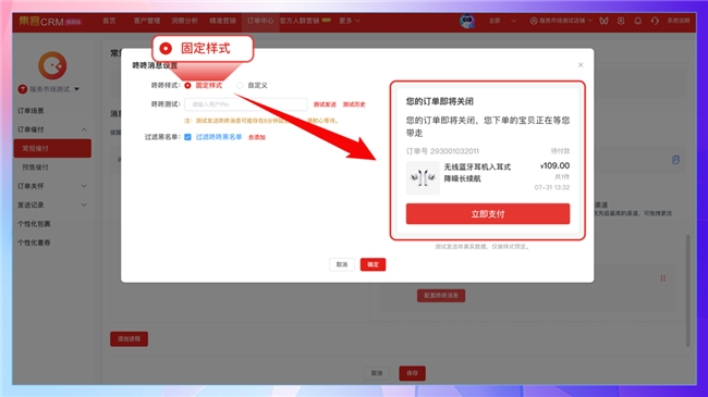 订单中心全面升级消息触达能力,催付、发货、退款三大场景可主动推送咚咚消息;已绑定壁垒订单的用户,支持无限制发送企微消息,且企微可兼容图片、链接、小程序、视频、文件等丰富内容形式,触达更高效、形式更多元。