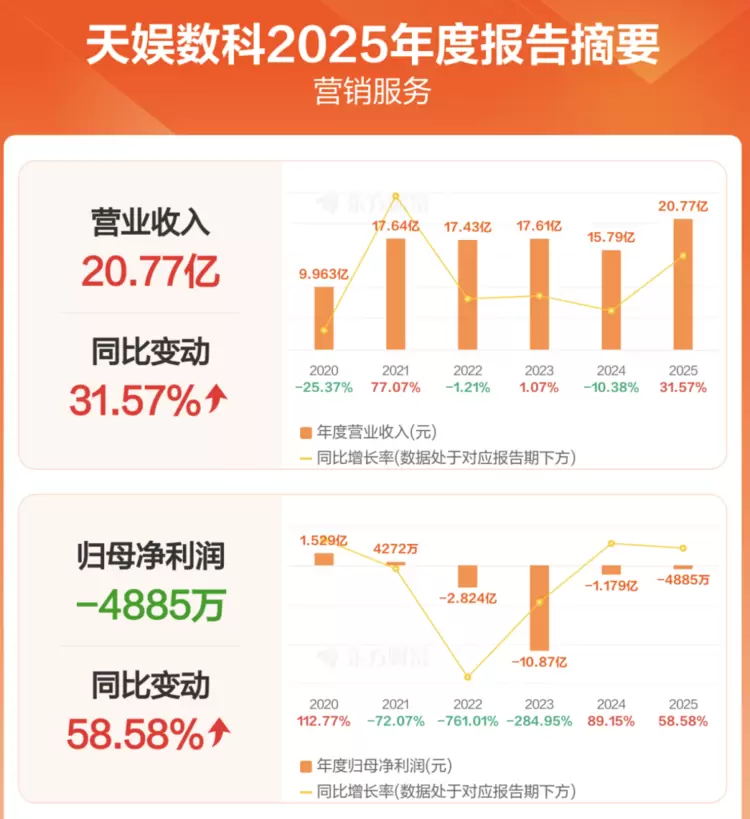 4月21日,天娱数科发布2025年年报。报告期内,公司实现营业收入20.77亿元,同比增长31.57%;归属于母公司所有者的净利润为-4885.13万元,亏损同比收窄。