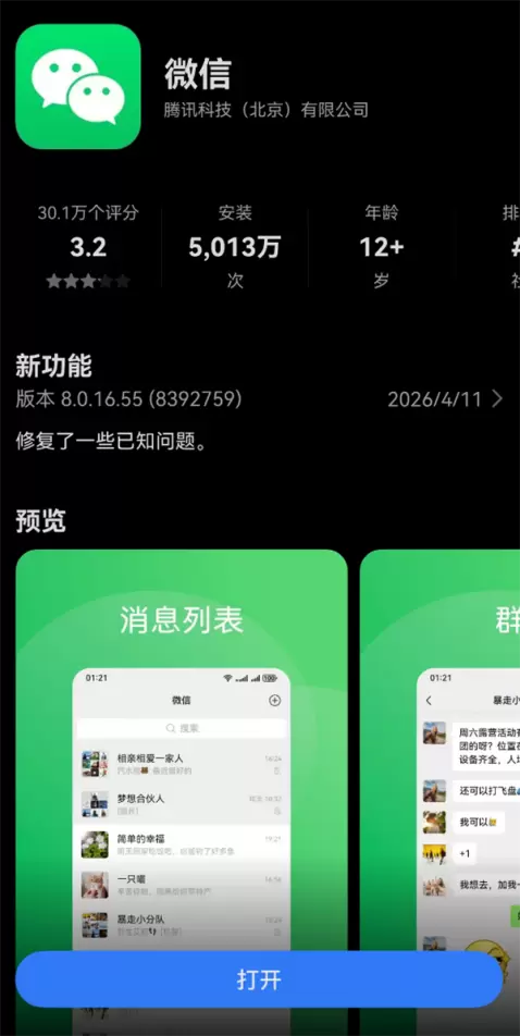 国民级应用微信,是鸿蒙生态迭代的标杆,更是生态发展的核心里程碑。截至2026年4月12日,微信鸿蒙版在华为应用市场的安装量已正式突破5000万次,增长节奏持续加快。2025年7月其安装量突破1000万次,同年12月达到3000万次,进入2026年后,2月跨越4000万次大关,仅两个月后便迈入5000万次级别。