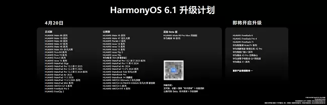 本次发布的HarmonyOS 6.1,将由Pura 90系列出厂预装,升级计划覆盖手机、平板、PC、智能穿戴、音频设备、智慧屏、智能家居等全品类终端,正式版、公测版、花粉Beta版有序推送,实现了全价位、全场景终端的广泛覆盖。其中,Mate 80系列、Mate 70系列、Pura 80系列等旗舰机型率先开启HarmonyOS 6.1正式版升级,同步覆盖MatePad Mini系列平板、WATCH GT6系列手表等多款终端;Mate X5系列、nova 12系列等热门机型同步开放HarmonyOS 6.1公测版升级通道,覆盖折叠屏、中端手机、PC等多品类产品;还有HarmonyOS 6.1花粉Beta版,支持Mate 80 Pro Max 风驰版、华为畅享 90 系列升级,为更多尝鲜用户提供提前体验的机会。全梯度的升级节奏,让不同机型、不同使用需求的用户,都能同步享受到HarmonyOS 6.1的全新体验。