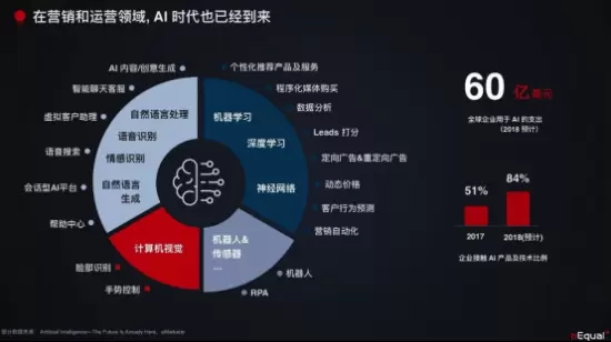 在营销和消费者运营领域,已经有超过85%的企业正在接触或已经开始尝试 AI 技术。任佩禹尝试将 AI 技术分为以下几类: