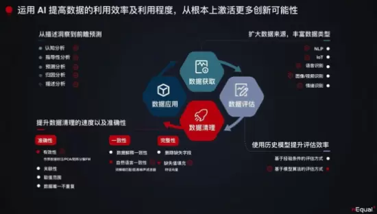 任佩禹认为,企业目前过多地关注 AI 上层应用,而忽视了 AI最重要的物料 – 数据。所有的应用离不开高质量的数据,但数据孤岛、数据脏,且随着数据源的增多,这些问题会更加严重。企业应该更关注数据本身,从数据处理、评估、清洗和应用各环节,全面应用 AI 技术,扩大数据来源,丰富数据类型,并预测新数据源所能带来的提升效果,通过算法进行数据有效性的校验,并解决缺失填充和数据一致性问题,从而使数据更加坚实可靠,让 AI 的应用场景从描述洞察真正走向前瞻预测,最终实现自动优化。