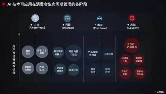 营销方面,如果将 AI 技术落在消费者营销的 AIPL 四个阶段中,每个阶段都有 AI 技术能够优化的场景。在认知阶段,我们可以利用 AI 技术进行更精准的定向,提高 Reach,可以进行内容的自动化生成以提高互动率;在兴趣阶段,我们可以基于消费者行为提供更个性化的落地页,更自动化的聊天互动;在购买阶段,对外我们可以为消费者提供更好的产品组合推荐、敏捷高效的咨询问答。对内我们可以进行 Leads 分级和智能的排班以提高效率;在忠诚阶段,我们可为消费者提供更个性化的忠诚度计划、全自动化的营销,进行流失防御和流失挽回。