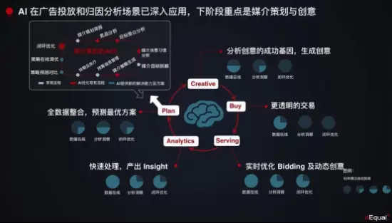 如果我们细看营销中广告投放这个领域,其实各环节所处的环境都有所不同,对 AI 技术的落地应该有先后的顺序。经实践,我们发现,最适用 AI 应用的无疑是投放环节。随着广告程序化交易比例的提升,基本全量数据都在,可比较方便的实现闭环的场景;其次是分析洞察。分析洞察的目的在于预测,所以我们认为 Planning 是接下来 AI 能够发挥更多价值的场景。我们调研了一些媒介策划执行人员,目前的现状是 Planner 没时间做 Planning,大量的时间耗费在走流程、收数据和处理基础数据上了。而 AI 能够帮助 Planner 优化现在繁琐、冗长的流程,并在策略调优和预测方面提供全新的能力。在中国,领先的广告主都已经把精力向 Planning 倾斜,尝试实现真正基于算法、基于全量数据的最优媒介投放策略的出具。