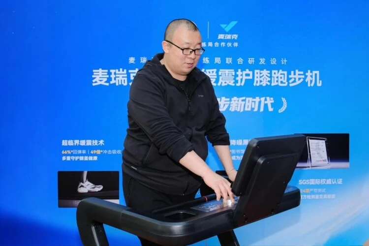 【袁先生在麦瑞克展位体验护膝跑步机幻影X5 Ultra】