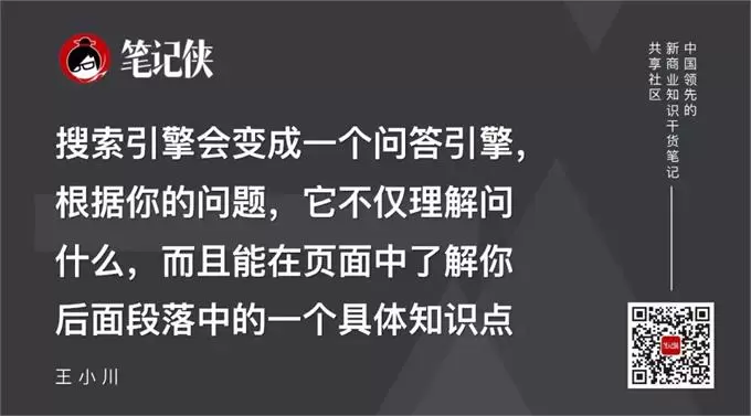 搜索引擎会变成一个问答引擎,根据你的问题,它不仅理解问什么,而且能在页面中了解你后面段落中的一个具体知识点。