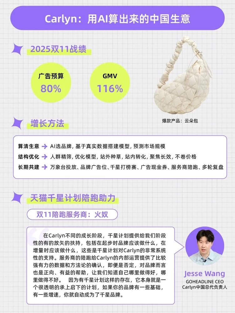 在 GOHEADLINE 的数字化赋能下,Carlyn 实现销售与品牌声量双重突破:2025 年 618 大促期间销量同比增长 400%,在箱包类目整体下滑态势下逆势登顶类目销量第一;2025 年双 11 以更优的投入产出比实现 GMV 大幅增长,中国市场一跃成为 Carlyn 全球第三大、增速最快的市场。与此同时,Carlyn 凭借出色的成长表现与品牌潜力,接连斩获2025 年度天猫千星奖、2026 年度天猫新锐品牌奖,成为天猫平台重点培育的标杆级海外新锐品牌,这一系列荣誉既是对 Carlyn 品牌实力的认可,更是对 GOHEADLINE 数字化管理能力与科技服务水平的权威肯定。