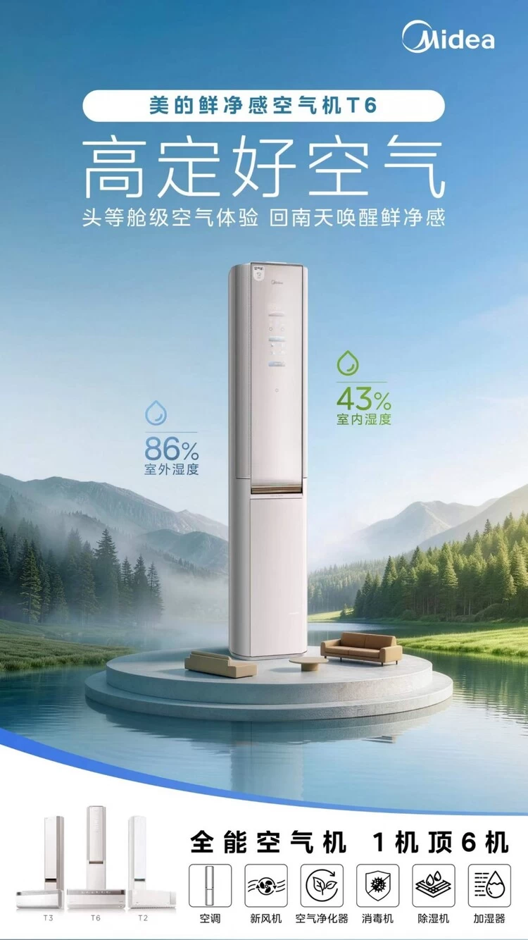 在消费升级的浪潮下,家电不再是冷冰冰的功能终端,更是点缀家居空间、传递生活品味的美学载体。当制冷制热与基础净化成为标配,如何让空调与家融为一体,成为生活美学的点睛之笔,是美的鲜净感空气机T6在设计之初的核心命题。