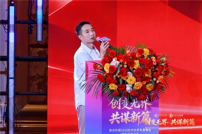 长沙拓美智能科技有限公司的廖明胜先生则作为卓越合作伙伴的代表发言。他用“相信”和“坚持”这两个词,概括和分享了过去10多年与科密结缘的心得体会,并表示,将继续专注于阳光科密的产品,努力坚持做好市场。