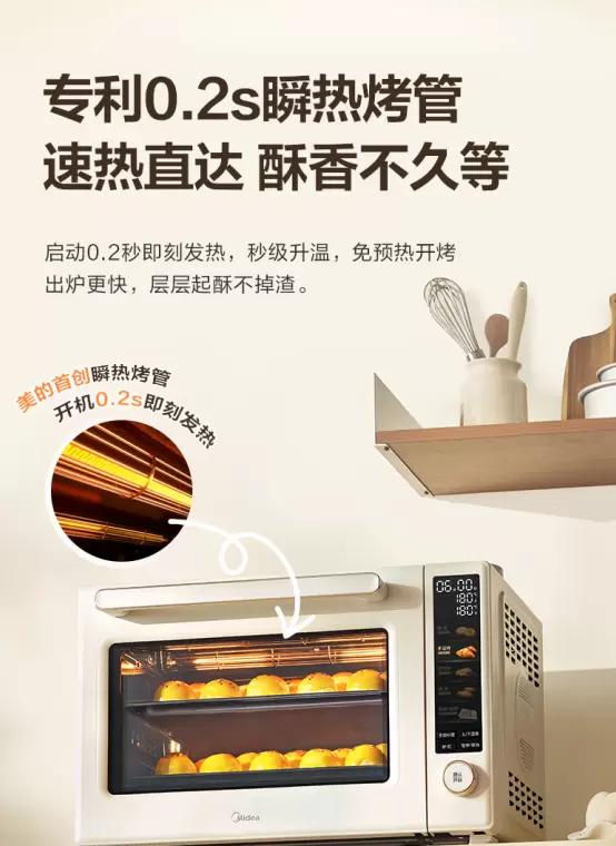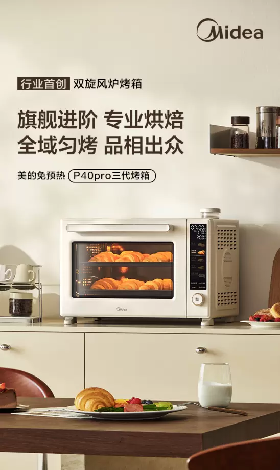 此次全新升级的美的 P40pro 三代烤箱,凭借专利0.2S瞬热烤管、首创专利双旋涡轮风炉、专利PID3.0智能控温算法+双NTC感温探头、搪瓷内胆、陶瓷不沾烤盘等核心技术,不仅帮助用户解决了预热时间长、温控不精准、烤箱难清洁的困扰,更让新手小白、烘焙爱好者轻松解锁专业烘焙乐趣,非常值得入手。其持续创新产品的背后,离不开其强大硬实力,依托于全球38个研发中心、2.3万名研发人员的后备力量和全球微波炉行业唯一的“灯塔工厂”智造实力,不仅专利保有量超过9339项,年度研发投入达到8.5亿元,同时美的联合多个高校院士团队,建立多个联合实验室,围绕射频加热、磁控管技术、微博解冻、低糖低脂、低盐、营养保留等方向持续技术攻关,持续为中国家庭带来健康、高效便捷烹饪和饮食新体验。据奥维云网数据,美的已连续七年荣获中国嵌入式蒸烤和微蒸烤线上销量市占率第一,成为广大消费者口碑信赖之选!