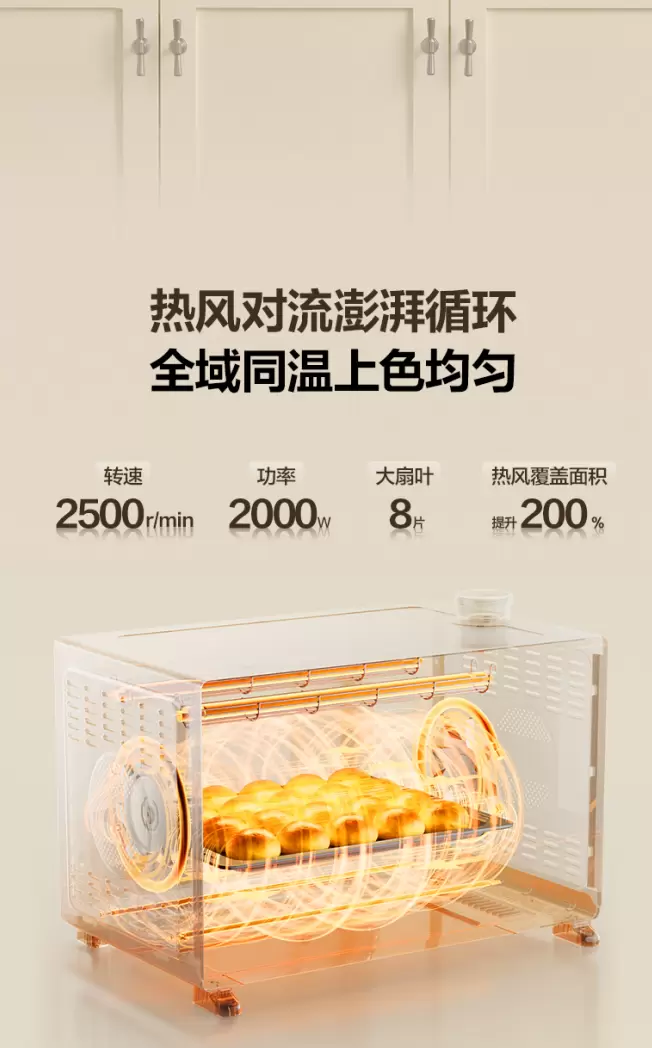 为进一步释放效率潜力,整机采用2100W 四面立体发热源+首创双旋涡轮风炉设计,上下发热管搭配左右热风系统,形成全方位、高密度热场,配合2500r/min高转速的正反转风机,让热量在腔体内快速循环、均匀渗透,多层同烤效率直接翻倍,全域同温上色均匀如一。实测数据显示,烤制9个可颂,免预热烘烤8分钟即可出炉,15个蛋黄酥,19分钟即可完美出炉,烘焙效率提升32%,对于快节奏的职场白领、时间紧张的精致宝妈而言,这款烤箱真正实现 “放进就烤、烤完即吃”,高效满足早餐、晚餐、加餐、烘焙等多元需求,让美味不用久等。