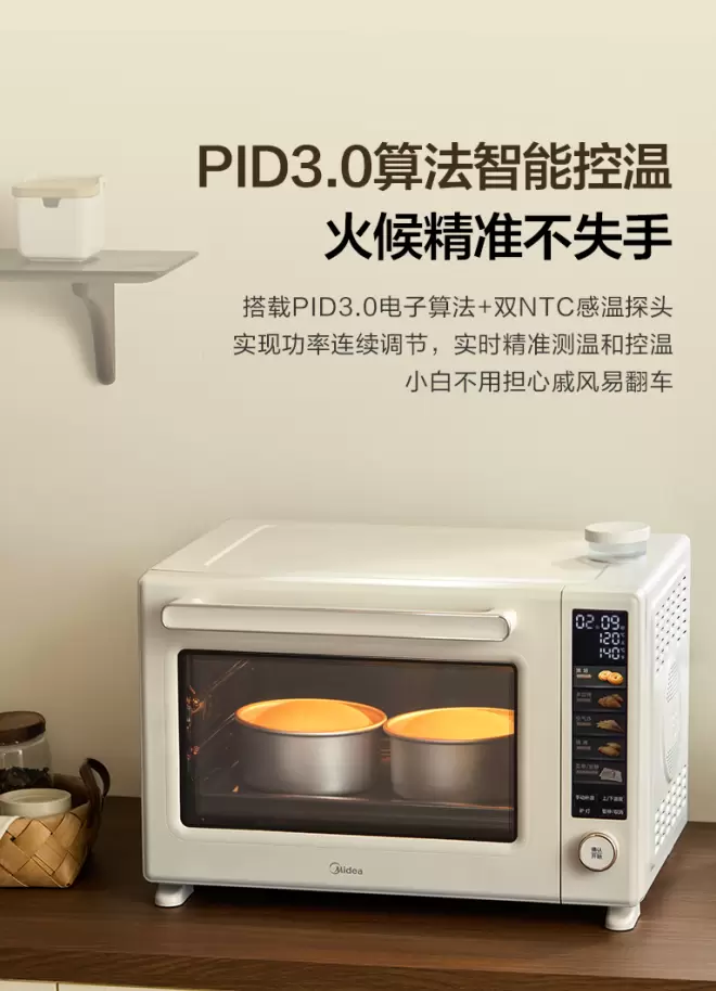 这款美的免预热烤箱P40pro三代,采用美的PID3.0 智能算法 + 双 NTC高灵敏感温探头,实现功率连续调节,实时精准测温和控温,做到控温精准,温差小,让烘烤食物受热更均匀,彻底解决了食材受热不均,外层焦糊,内部夹生的尴尬,让烤制的牛排外焦里嫩、蛋糕蓬松不塌腰。同时它还配备专业水雾补湿功能,烘焙发酵双效实用,水雾大且均匀,提供自动/手动双模式,不管新手还是进阶都能玩转烘焙。